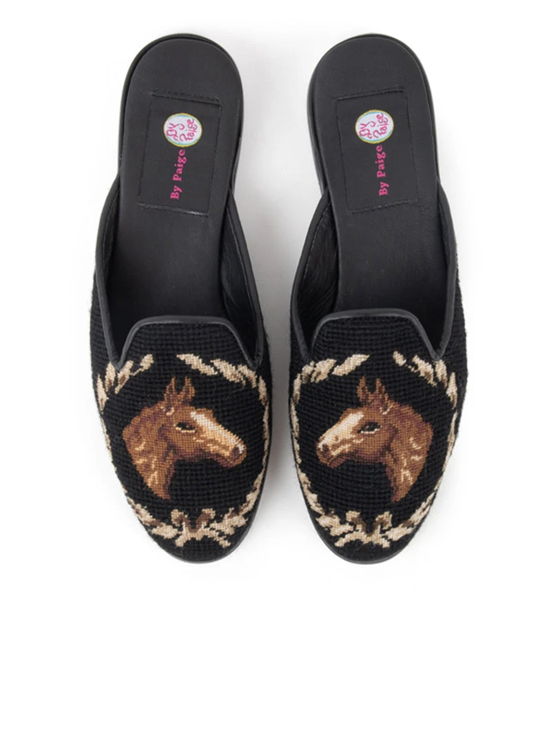 A handstitched needlepoint mule with whimsical designs to fit your every mood. Leather trim and lining.Â
