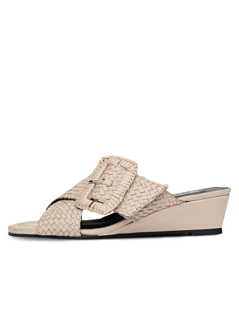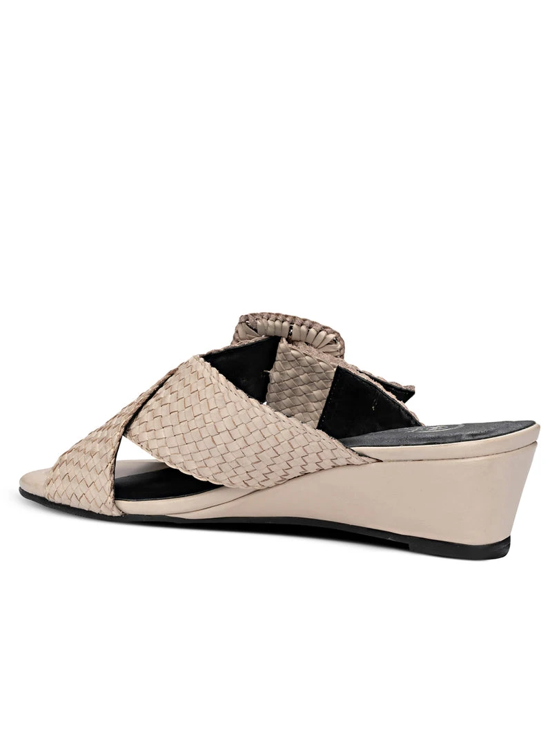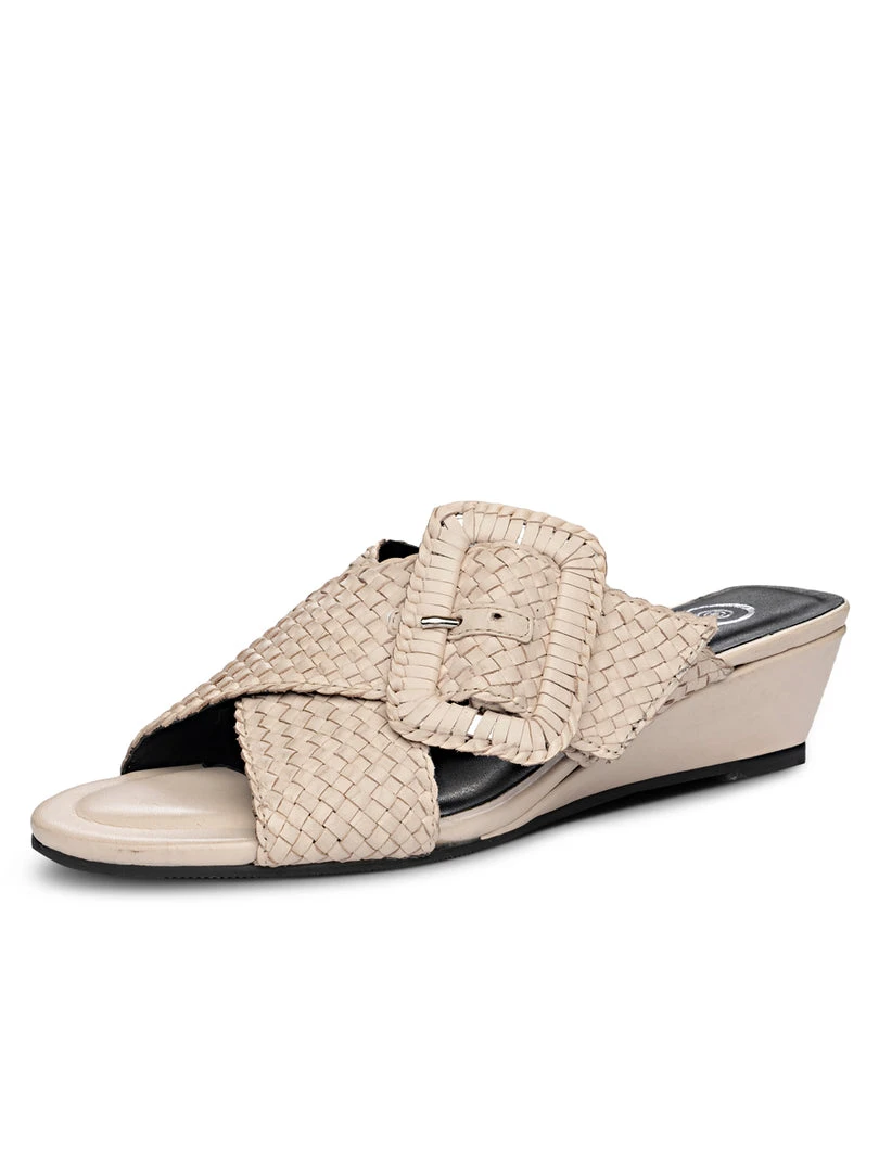 Wedge slide sandals adorned with a buckle are classically vintage. The wedge adds support and style to these beautifully woven leather slides.Â