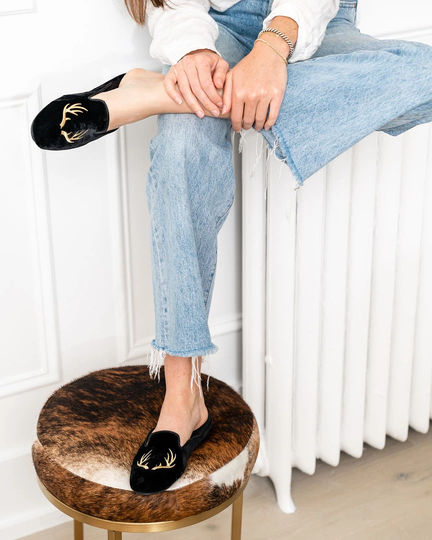 In luxe velvet, slip into these beauties and relax your soles. Gold antler embroidery with a hidden 1 inch wedge. Treaded rubber sole, which means these can be worn both indoor or outdoor.Â