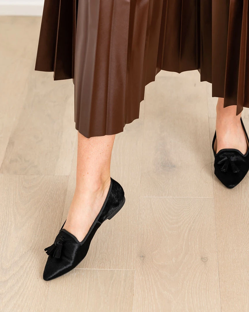 A sculpted pointed toe silhouette in luxe hair calf for a rich addition to your fall and winter shoe collection. Finished with a tassel detail and rubber sole, these shoes will carry you in style and comfort from day to night.Â