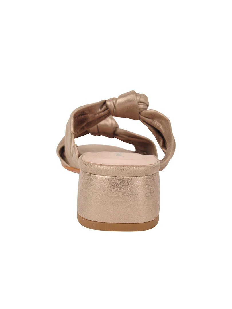 A low heeled block sandal with knotted leather detailing along the straps.Â