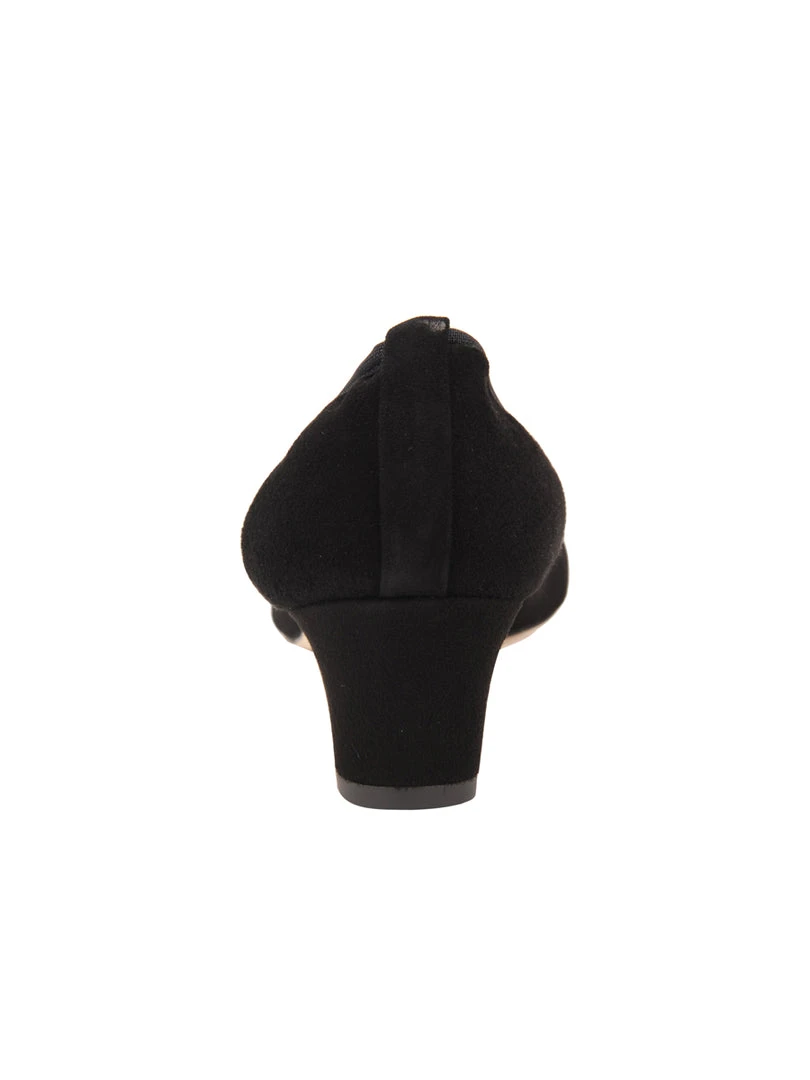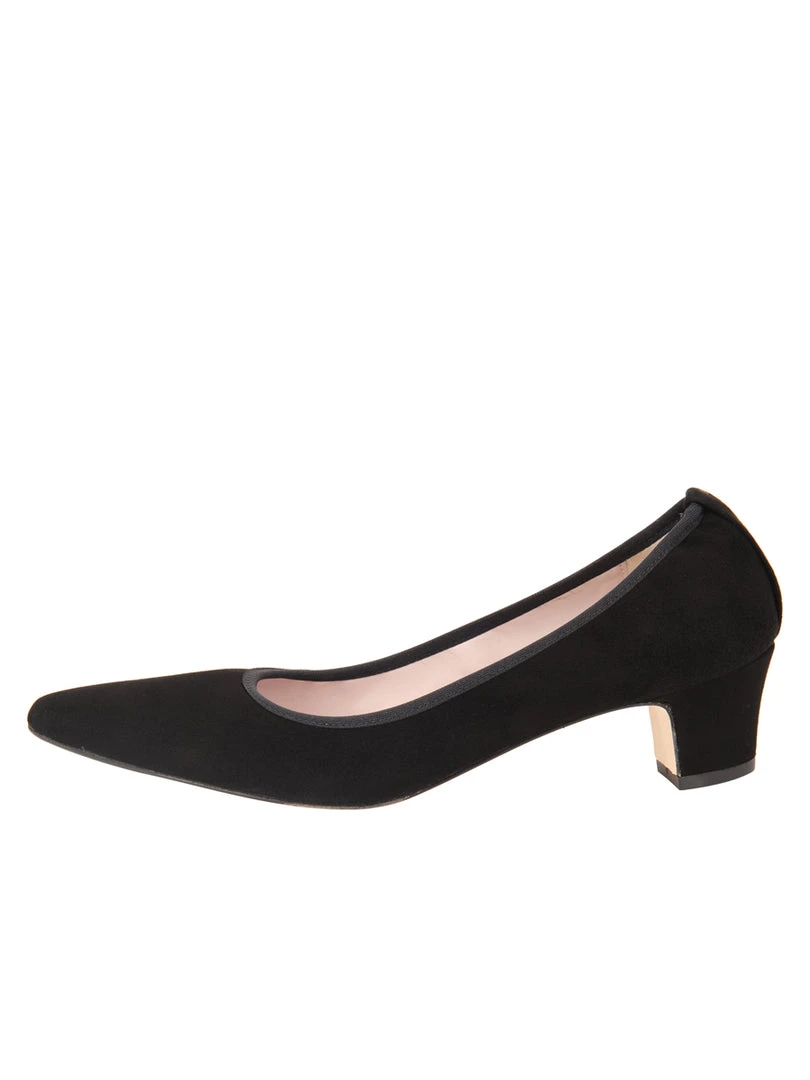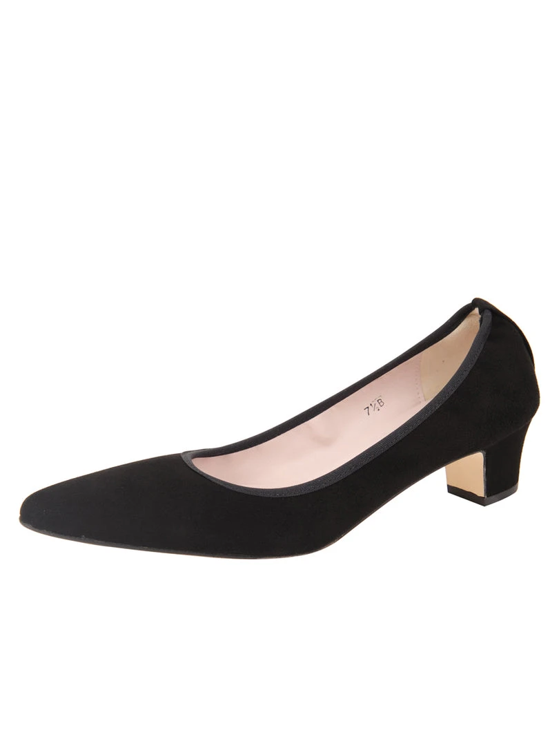 A sophisticated suede lightly pointed pump with elasticized throat line and low everyday heel. In rich, supple suede the silhouette is easy and timeless that you’ll love and wear for years to come. This pump has a slightly narrow fit with an elasticized back for a secure fit and extra comfort.