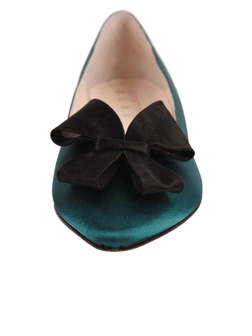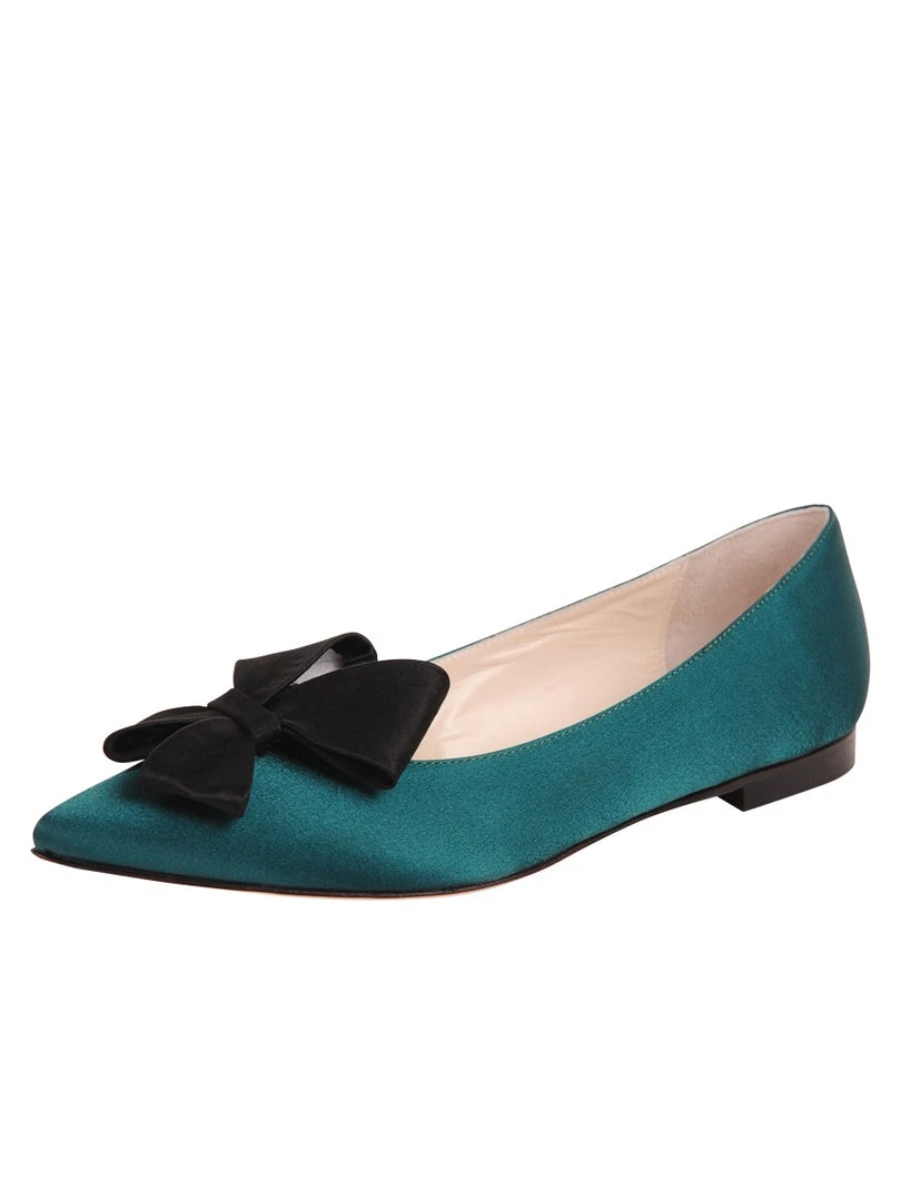 Stunning satin or suede covers these pointed toe flats. A satin Butter Bow makes these versatile and timeless.